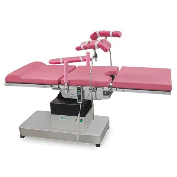 Full adjustable Height, up to 95 cm, is adjustable by electric engine (6000 N power) with foot control, head section is adjusted by a gas cylinder (400 N power), central section by a gas cylinder (600 N power) up to 65°.
